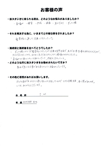 4.どのような方に当スタジオをお勧めされたいですか? 一人一人に合ったトレーニングメニューを考えてくれるので 少しでも身体の悩みがある人は是非トレーニングを!! 5.その他ご感想があればお願いします。 トレーニングを始めて3ヶ月!!自分でもこんなに続くとは思っていなくて。 結婚式が終わっても身体の為にトレーニングは続けたいと思っています。 |
